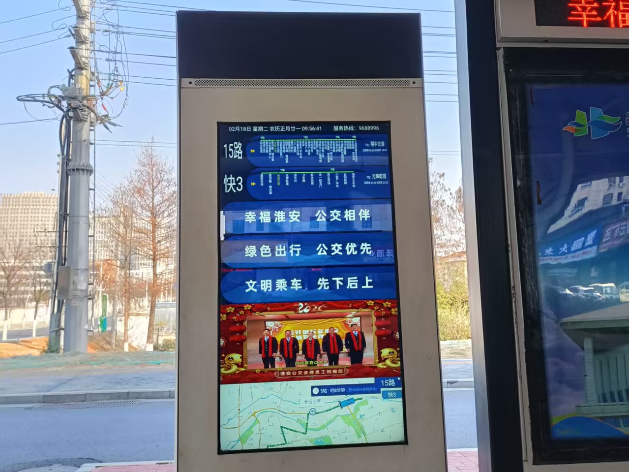 智慧交通公司打造的“互联网+智能公交电子站牌”项目,构建了智能监控调度、高清视频监控、多媒体信息发布等功能于一体的新一代智能化公交站台。